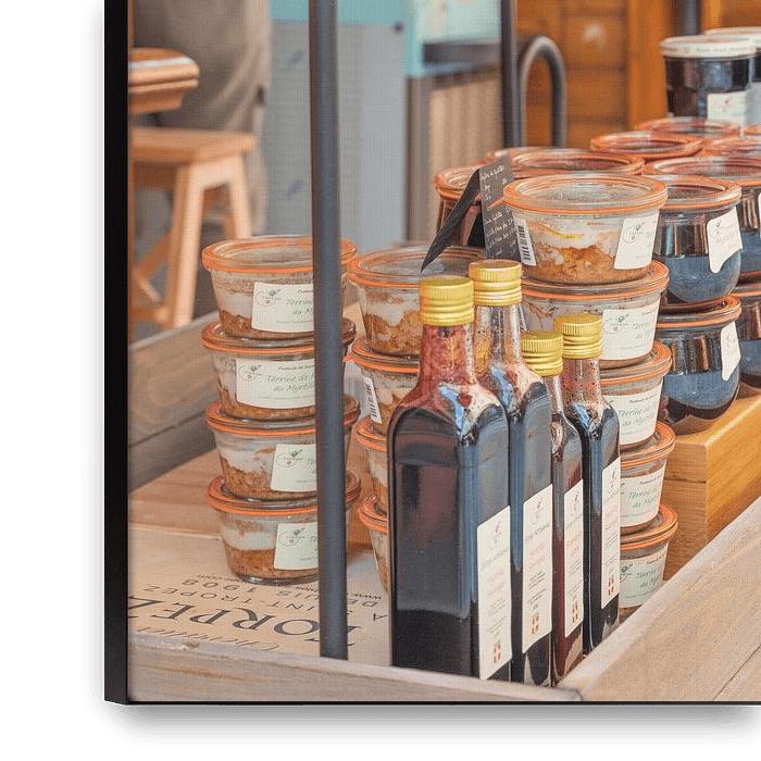 Des produits aux couleurs pastel bordaient la rue. Dans un café, il y avait une délicieuse gamme de produits. Miel, sirop, confiture et biscuits.