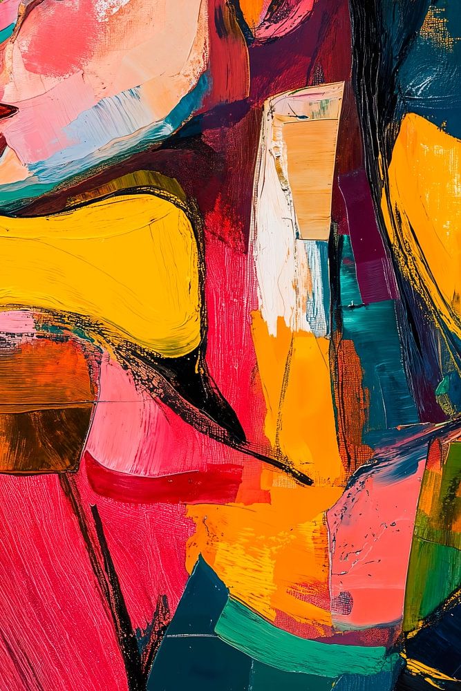 Portrait abstrait et vivant d'une femme, dont la peau est représentée par des coups de pinceau puissants et expressifs dans un kaléidoscope de couleurs. Le style général rappelle le cubisme et l'expressionnisme , avec des angles vifs et des formes fragmentées. Les couleurs sont riches et saturées, ce qui crée un impact visuel puissant.