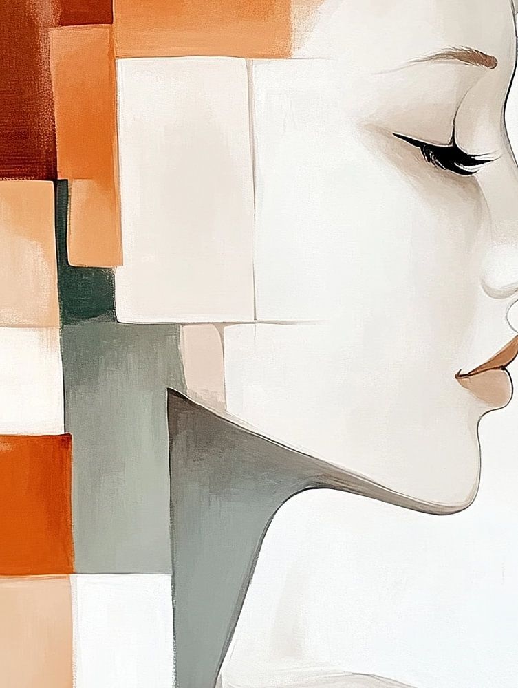 Profil de femme - Sérénité géométrique - Ce portrait moderne représente le profil latéral d'une femme, stylisé avec des blocs géométriques abstraits dans une palette de blanc, d'orange et de gris. Le regard serein de la femme et l'harmonie des couleurs attirent l'attention.