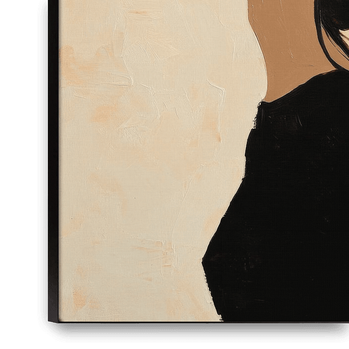 Dans des tons doux et terreux, une silhouette pensive brille, la tête légèrement levée vers le ciel. Le contraste entre les vêtements sombres et le fond clair renforce l'expressivité du visage et des lèvres fermées. Un moment de paix intérieure et d'espoir se fait sentir, comme si elle sondait une vérité cachée.
