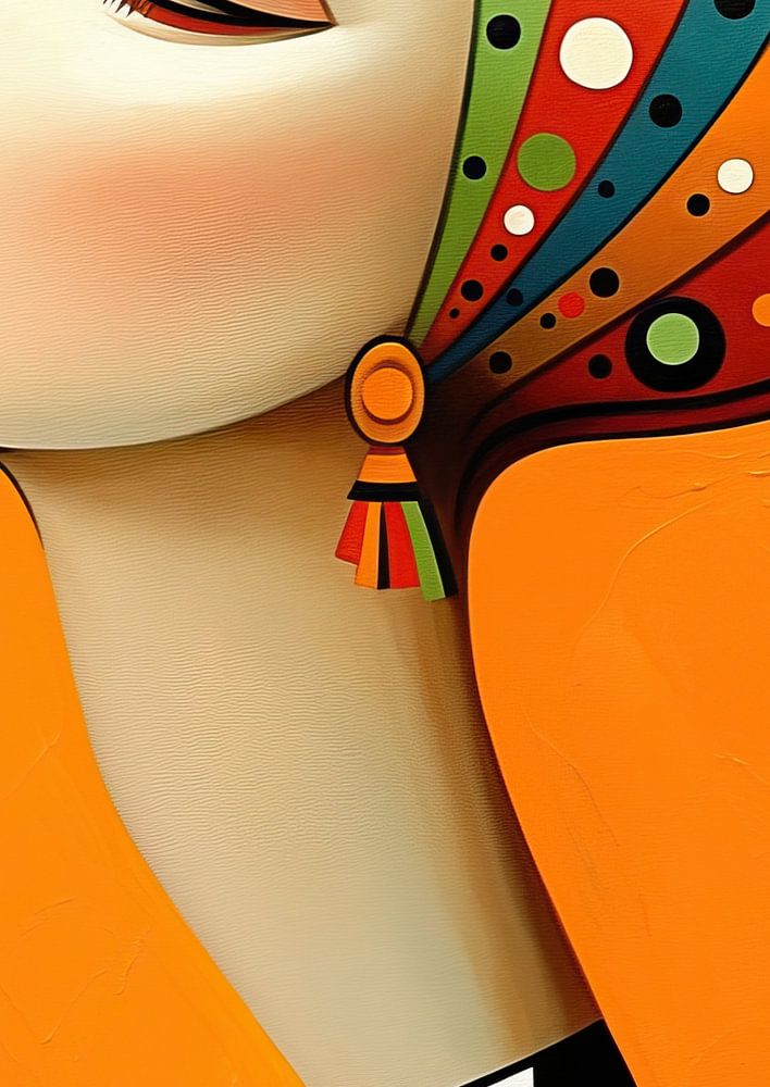 Profil serein, teintes vives - Cette peinture pour femmes représente un visage féminin stylisé, de profil, avec des yeux fermés, des lèvres rouge vif et un bandeau coloré ; l'arrière-plan est divisé en blocs forts de vert, d'orange et de jaune.