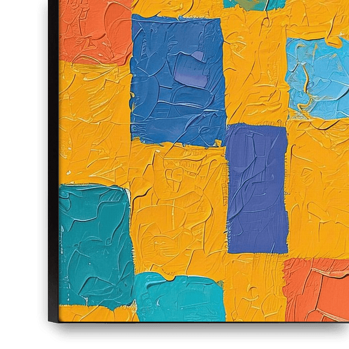 De keuze voor het achtergrondraster en de zon voelt intentioneel: de vakken geven ritme, bijna als muzikale maatstrepen, en de zon met zijn concentriciteit geeft een centraal idee van warmte en aandacht. Daardoor lijkt de figuur niet alleen een persoon, maar ook een toonbeeld van samenspel tussen innerlijk en omgeving — de abstracterwordendepatroneninhaarenblousesuggererenherinneringenlaagheid,terwijldezuiverevormenvanbrilenzonhelderheidenaanwezigheidbieden.Ditschilderijvrouwnodigtjeuitomdichtbijtekomenenteblijven,telezenindetextuur,depenseelstreekendespeelsedetailsdienetnietallesprijsgeven.