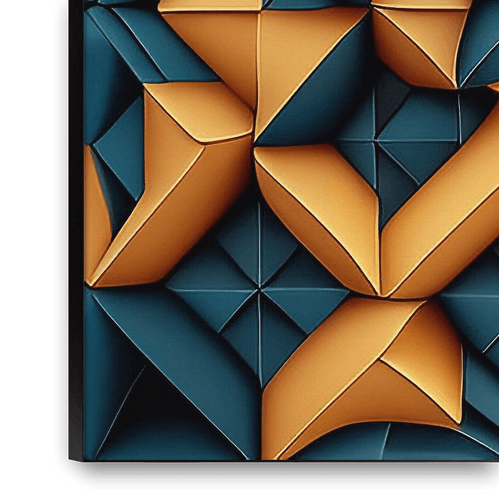 Cette image montre un motif géométrique complexe composé de formes tridimensionnelles imbriquées les unes dans les autres, dans des tons bleu-vert et or. Chaque élément individuel au sein du motif ressemble à des formes pliées de type origami, ce qui crée une sensation de profondeur et de texture sur toute la surface. La combinaison…