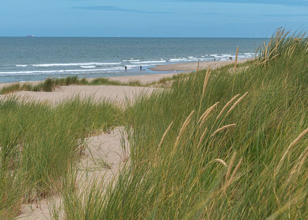 Au milieu de l'été, en se promenant dans les dunes de la Maasvlakte, où le vent souffle dans l'ammophile, on a une belle vue sur la plage. Cette image montre qu'il existe un bel équilibre entre l'industrie et la nature sur la Maasvlakte.