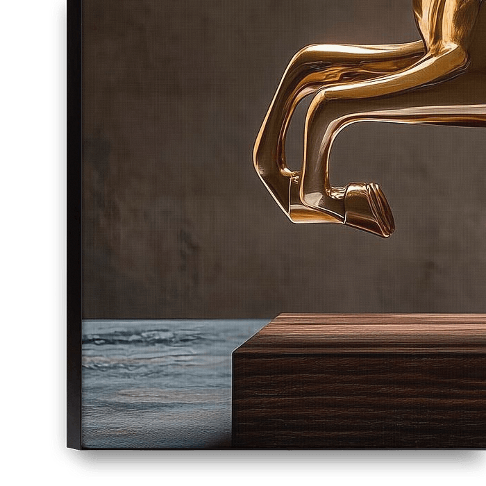 Une œuvre d'art qui capture l'essence de la force et le mouvement dynamique d'un cheval dans une représentation minimaliste mais puissante en version dorée.
