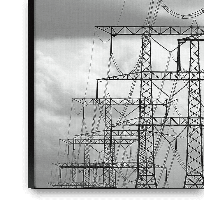 Pylônes électriques et lignes à haute tension contrastant avec un ciel nuageux.