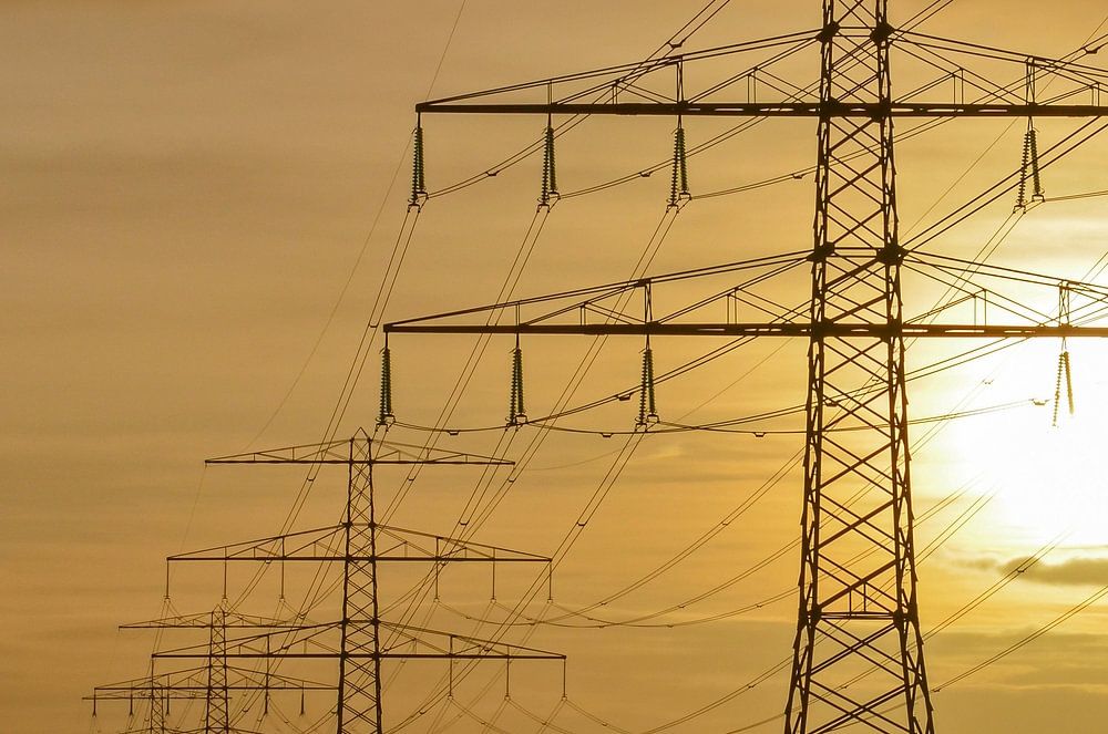 Pylônes haute tension dans l'après-midi, photographiés sur une journée ensoleillée mais froide en Janvier sur une randonnée de Uithuizen à Loppersum, Groningen, Pays-Bas.