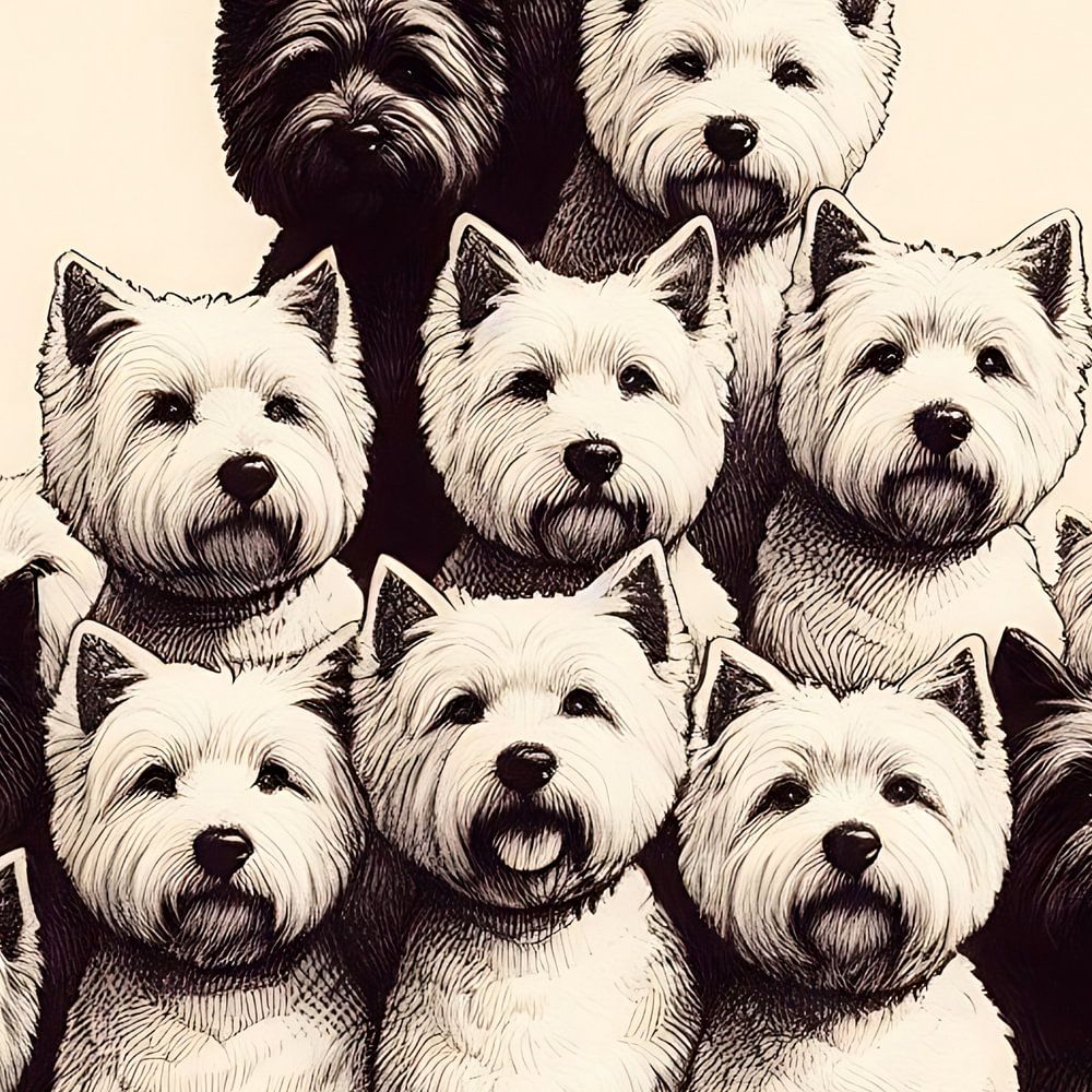 Des chiens blancs et noirs Westie (West Highland Terrier) mignons disposés en pyramide et qui regardent la caméra avec attention.