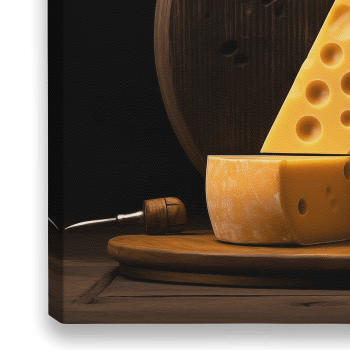 La peinture de la pyramide de fromage est un portrait frappant et de bon goût qui rend un hommage ludique et élégant à l'un des mets les plus appréciés. L'œuvre représente une pyramide de fromages soigneusement construite. Le fond sombre crée un beau contraste, donnant vie aux textures et aux nuances des fromages et conférant à…