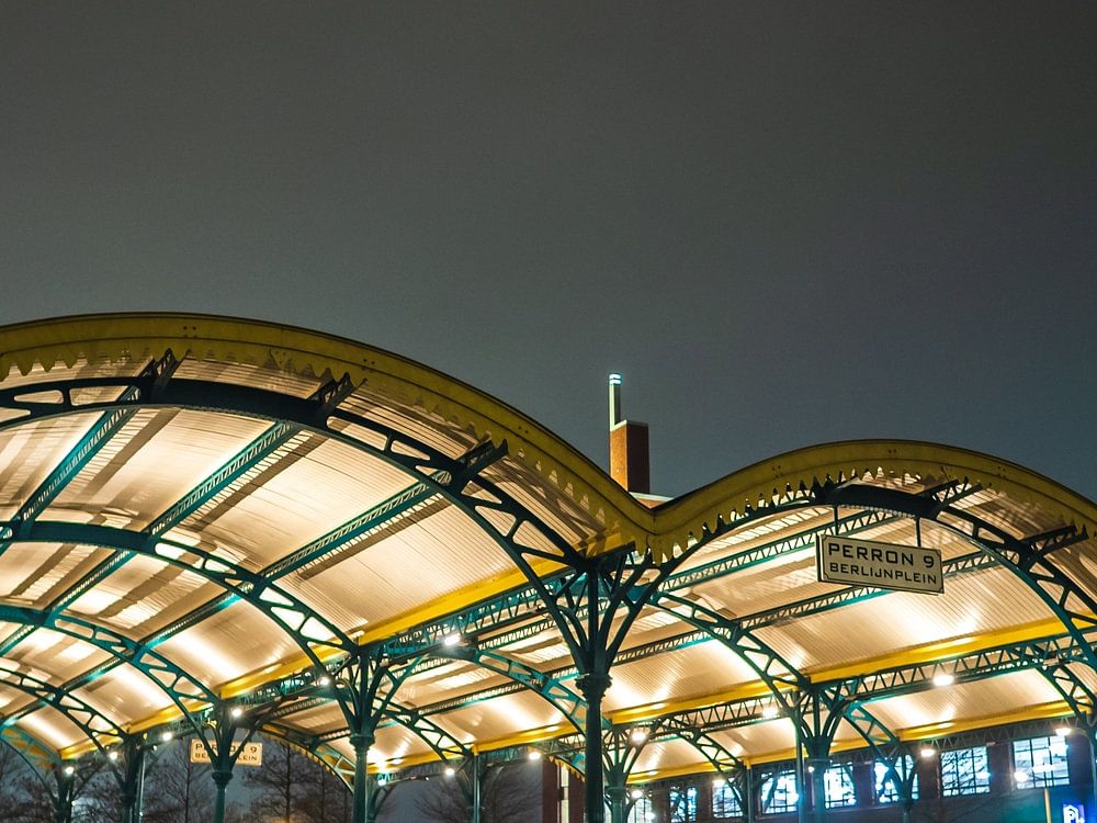 Le soir, le quai 9 de la place de Berlin à Utrecht Leidscherijn est peut-être encore plus beau que le jour. Il est magnifiquement éclairé et se détache très bien de toutes les autres architectures construites autour de la place. Les capuchons de quai étaient autrefois utilisés à la gare centrale d'Utrecht et ont été réaffectés à Leidscherijn depuis quelques années.