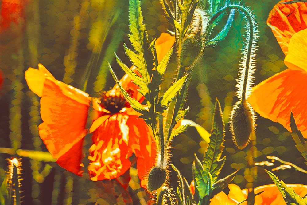 Quelque part dans le champ de fleurs, une jeune fille rêve, elle ne fait plus qu'un avec son environnement. Peut-être rêve-t-elle de ces vastes champs de fleurs à perte de vue avec des papillons en plein été. Le soleil brille intensément, comme en témoigne la lumière qui traverse les fleurs et les dépasse. Il fait vraiment chaud et ensoleillé, et cela se voit dans les couleurs. Les coquelicots font de leur mieux pour être aussi beaux que possible. Ce dont elle rêve est une question pour vous et un savoir pour elle, peut-être d'une belle nature. La couleur de son visage peut trahir son humeur, mais c'est peut-être aussi de la timidité ou simplement de la chaleur. Les couleurs de cette œuvre d'art estivale et colorée sont le rouge, l'orange, le cyan, le vert, le marron et le jaune.