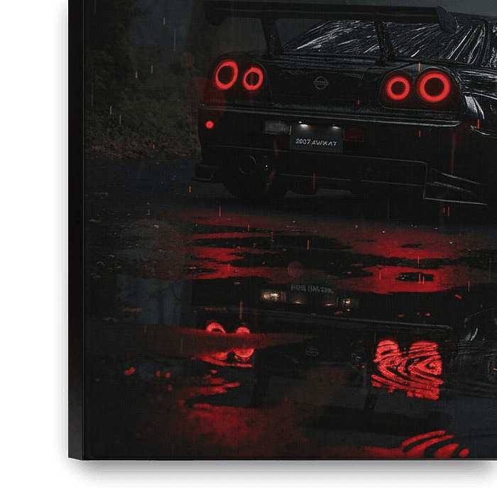 Une emblématique Nissan Skyline GT-R R34 (R34 Ghost) fait une apparition spectaculaire et solitaire dans une forêt sombre et pluvieuse, ses feux arrière rouges emblématiques jetant une lueur sinistre.
