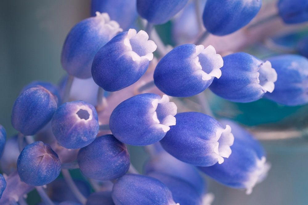 Photo macro de raisins bleus dans un vase bleu. Les couronnes blanches de chaque fleur exceptionnelle s'accordent avec le reflet blanc du vase en verre.