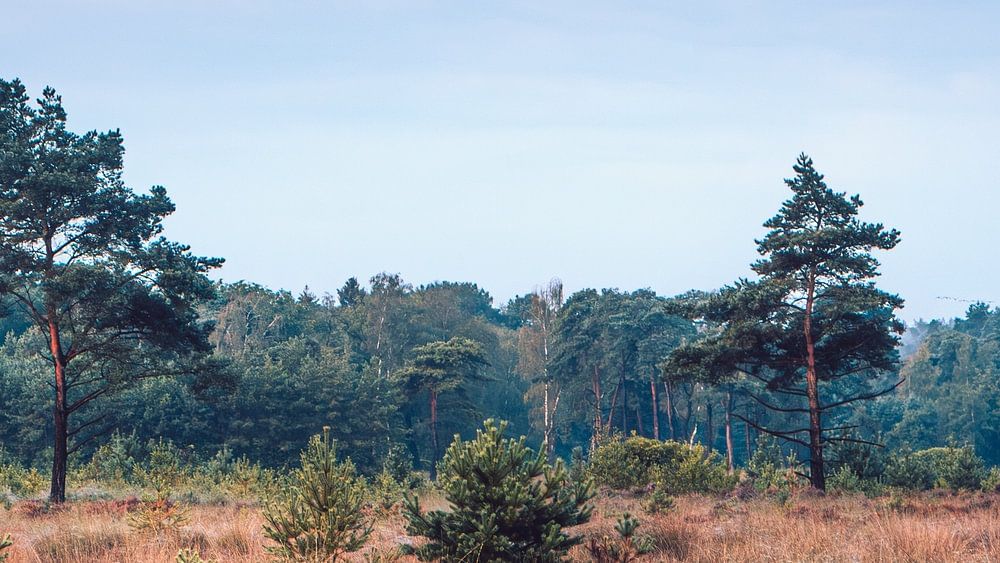 Une belle matinée d'été sur la Kalmthoutse Heide. Le soleil matinal éclaire et accentue certaines parties des troncs brun-rouge de ces pins qui se dressent à la lisière de la forêt, parmi les hautes herbes.