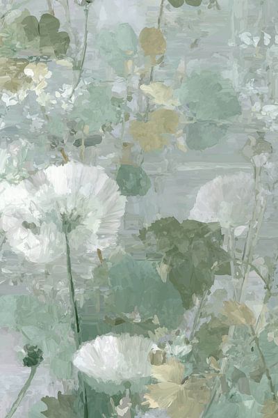 scène de champ rêveuse dans laquelle des fleurs blanches s'ouvrent dans une brume de nuances de vert. La composition est libre, presque impressionniste, ce qui donne à l'image l'impression d'être le souvenir d'une promenade estivale. Les fleurs semblent se fondre doucement dans leur environnement, comme si elles faisaient partie du ciel…
