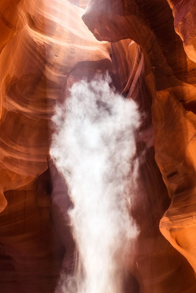 un célèbre canyon situé dans l'État de l'Arizona, aux États-Unis. L'image capture un phénomène naturel rare : un faisceau de lumière tombant à travers une ouverture au sommet du canyon, illuminant un nuage de poussière flottant. Cela crée une atmosphère presque magique où la lumière et la pierre s'unissent de manière unique.