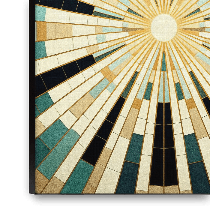 Une peinture numérique abstraite classique avec des rayons de soleil. Cette œuvre s'inspire des formes et de la palette de couleurs du mouvement artistique Art déco des années 1920. L'œuvre donne un aspect élégant et classique à votre intérieur !