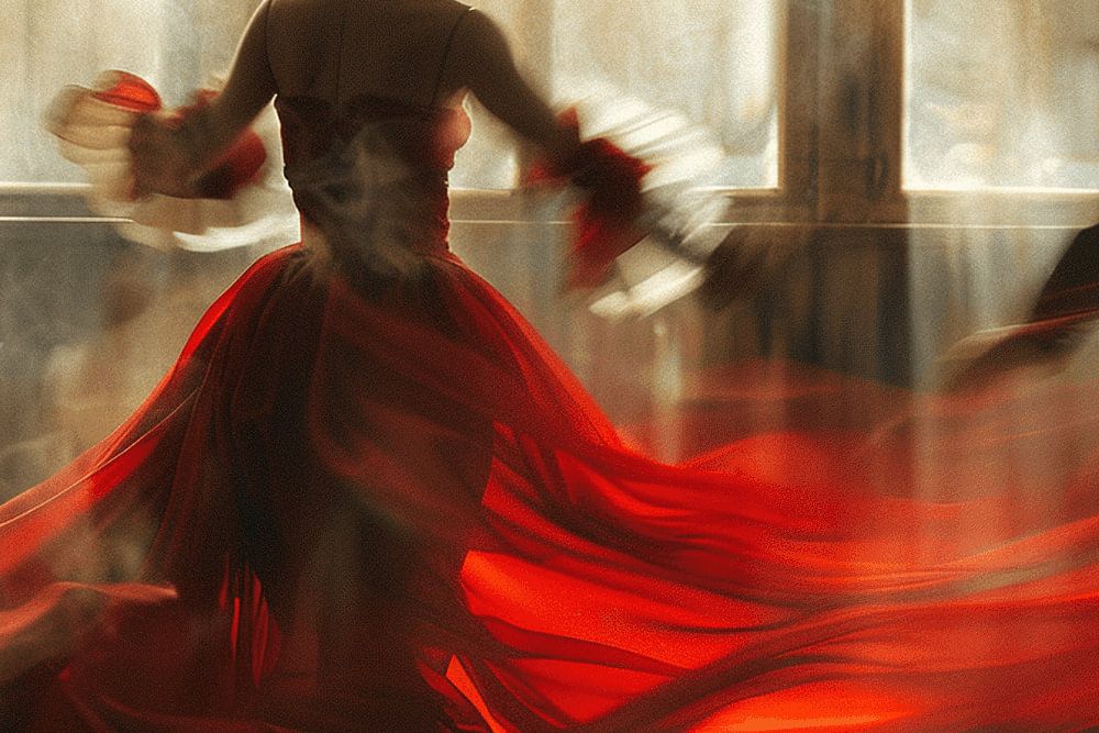 La danse flamengo, c'est la passion et le feu. Ce feu est visible ici dans le mouvement de la robe frénétique portée par la danseuse.