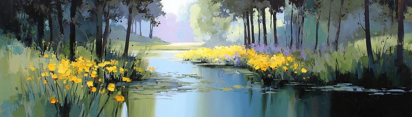 Spiegeling Goud - Hier valt eerst het licht op: een smal water dat als een spiegel door het doek snijdt, omzoomd door een explosie van gele bloemen. Het water is bijna het centrale zenuwstelsel van dit landschap — een meer schilderij waar de lucht en oever elkaar spiegelen en waarin kleurvlakken rust en beweging tegelijk uitstralen. De…
