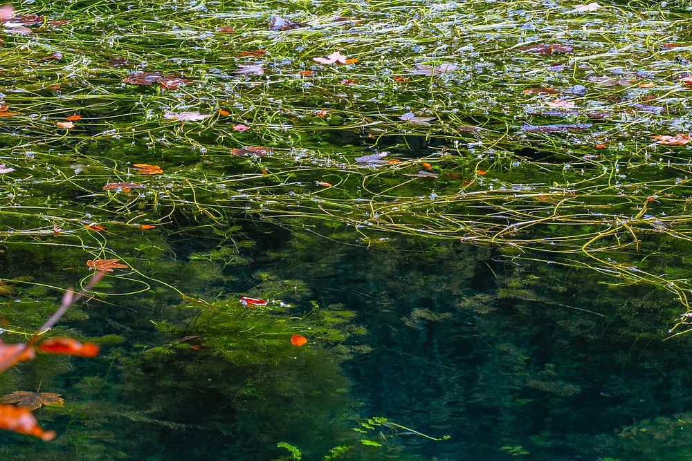 Des feuilles d'automne dorées encadrent la source karstique claire du Blautopf. Des plantes aquatiques d'un vert éclatant se balancent dans les profondeurs turquoises. Une interaction colorée entre le monde en surface et le monde sous-marin à Blaubeuren.