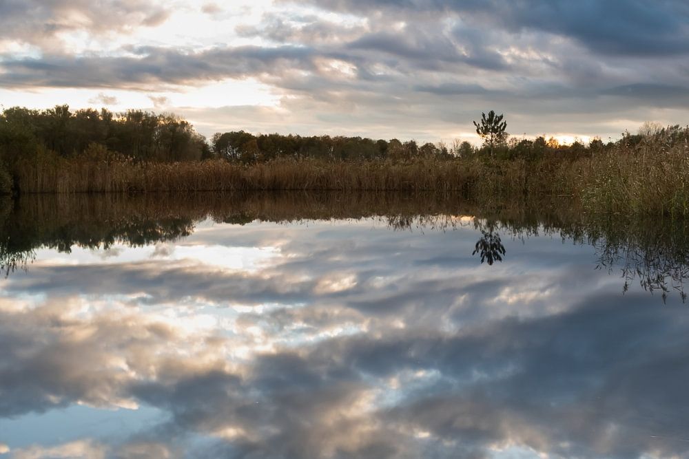 La zone de loisirs Geestmerambacht, en Hollande septentrionale, est une zone naturelle magnifique. Non seulement pour les loisirs, mais aussi comme lieu de prise de photos, cet endroit est un gagnant. Ce 'petit lac&#039 ; est situé sur la plage de sable artificielle et est séparé du grand lac par des roseaux. Par conséquent, en cette soirée d'automne, l'eau était merveilleusement calme et fonctionnait comme un miroir. Au coucher du soleil, les nuages typiquement hollandais sont passés et se sont reflétés dans l'eau calme. Un double plaisir !
