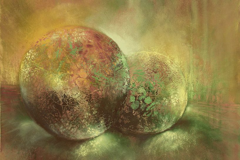 Le tableau "Lyric Echoes in Green and Gold" d'Annette Schmucker déploie une aura à la fois méditative et hautement énergétique qui fascine immédiatement le spectateur. Au centre de la composition flotte une sphère majestueuse et lumineuse qui ressemble à un joyau précieux ou à un corps céleste lointain. La palette de couleurs est…