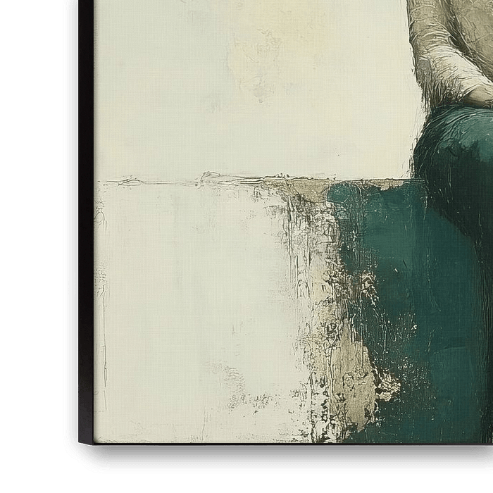Réflexion - Contemplation silencieuse - Ce tableau pour femmes représente une jeune femme mélancolique vêtue d'une élégante jupe verte, assise, la tête inclinée et les cheveux blancs tombant doucement, sur un fond serein aux tons clairs.