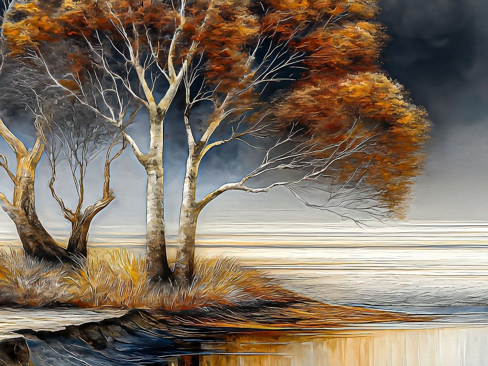 Nature et paysages, Couleurs chaudes d'automne (en contraste avec le gris froid), Mystérieux et atmosphérique, Moderne et contemporain, Peinture de paysage, Couleurs d'automne, Or, Argent, Groupe d'arbres, Reflet, Tempête, Ciel nuageux, Nature, Solitude, Texture, Contraste, Paysage riverain, Dramatique, Ambiance automnale, atmosphérique, modernliving, Paysage horizontal