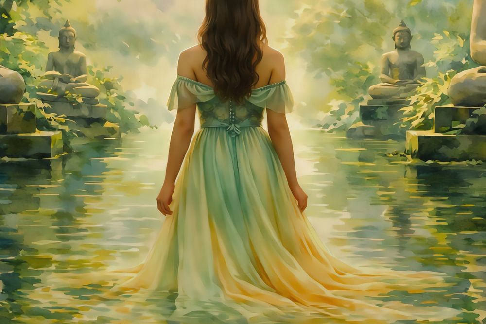 Il représente une femme vêtue d'une robe légère, debout dans une eau peu profonde jusqu'aux chevilles. Elle détourne le regard du spectateur, tourné vers une lumière claire et éclatante qui brille à travers les arbres. De chaque côté d'elle,…