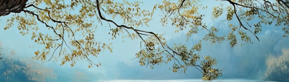 Reflet d'arbre - Cette peinture de paysage montre un grand arbre impressionnant dont les branches s'étendent au-dessus d'un reflet bleu tranquille dans l'eau, évoquant une atmosphère sereine avec un soupçon d'automne à travers les subtiles feuilles jaune-vert.