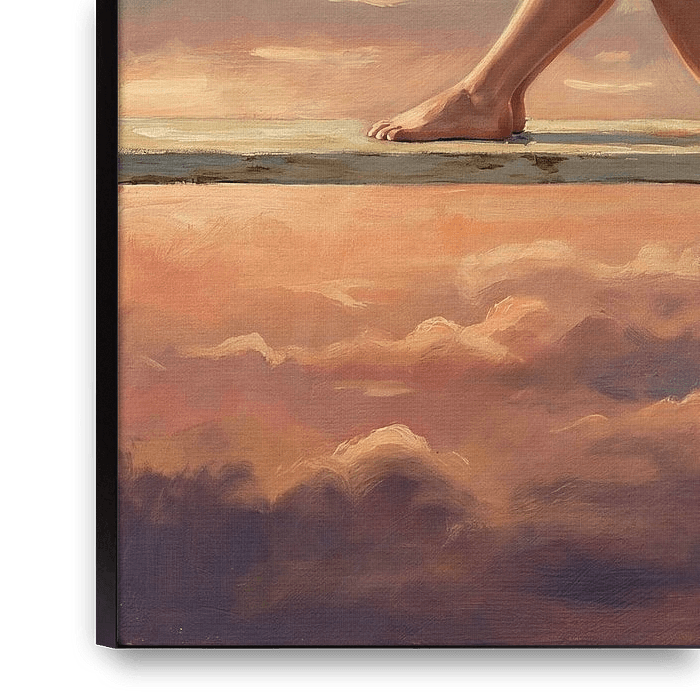 La plate-forme, élément simple mais évocateur, sert de pont entre le tangible et l'éthéré. Elle ancrage la composition tout en soulignant l'immensité du ciel qui l'entoure. Les teintes chaudes des nuages - roses tendres, oranges et violets - suggèrent la beauté éphémère du lever ou du coucher du soleil, métaphore des transitions et des moments fugaces de la vie.