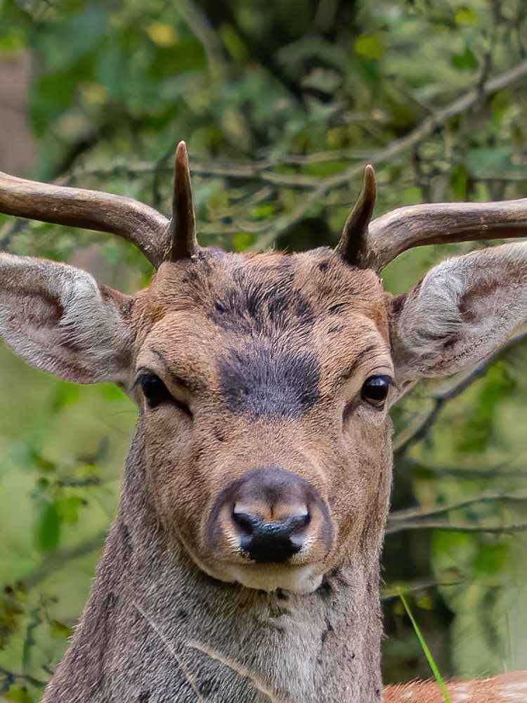 Photo d'un cerf prise dans les dunes d'approvisionnement en eau d'Amsterdam. Le cerf se reposait entre les arbres et me regardait avec impatience.