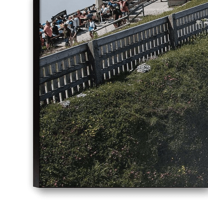 Cette photo montre un impressionnant refuge de montagne perché au bord d'une falaise abrupte, entouré d'une mer de nuages. La structure en bois et la terrasse avec les visiteurs donnent une atmosphère authentique et rustique, tandis que le drapeau autrichien flotte fièrement dans l'air frais de la montagne. Le contraste entre la cabane solide et la brume mystérieuse qui en cache les profondeurs crée une image dramatique et presque surréaliste. Le ciel bleu clair au-dessus des nuages ajoute un sentiment de liberté et de hauteur. Cette image est idéale pour les blogs de voyage, les décorations murales, les magazines de plein air ou les promotions de tourisme de montagne. L'image évoque l'aventure, la force de la nature et la beauté sereine, vous invitant à faire l'expérience du silence et de la grandeur des Alpes. Elle est parfaite pour tous ceux qui aiment les paysages de montagne et les perspectives uniques.