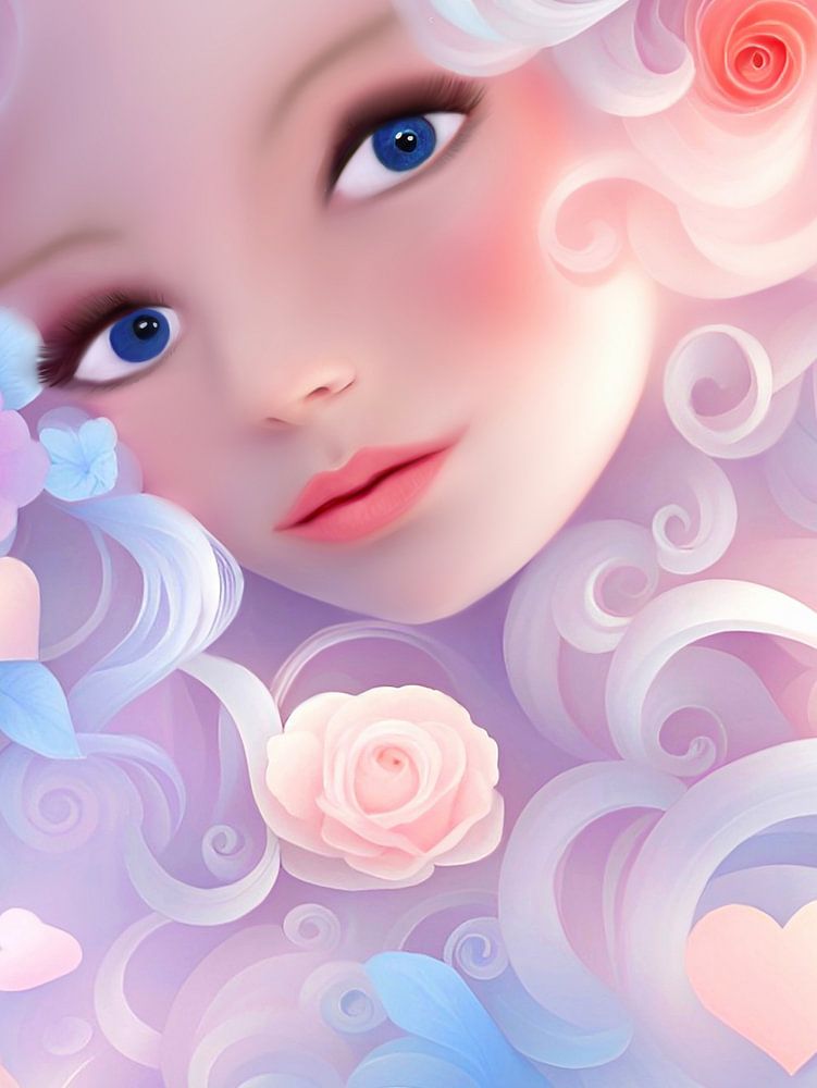 Cette œuvre d'art faite à la main respire la douceur, l'amour et la sérénité. Le visage d'une douce jeune fille est entouré de fleurs pastel dans les tons rose, bleu clair et lilas, qui créent ensemble une atmosphère de rêve et d'amour. Ses yeux radieux d'un bleu profond forment le cœur de l'image, invitant au silence, à la confiance et à la paix intérieure.