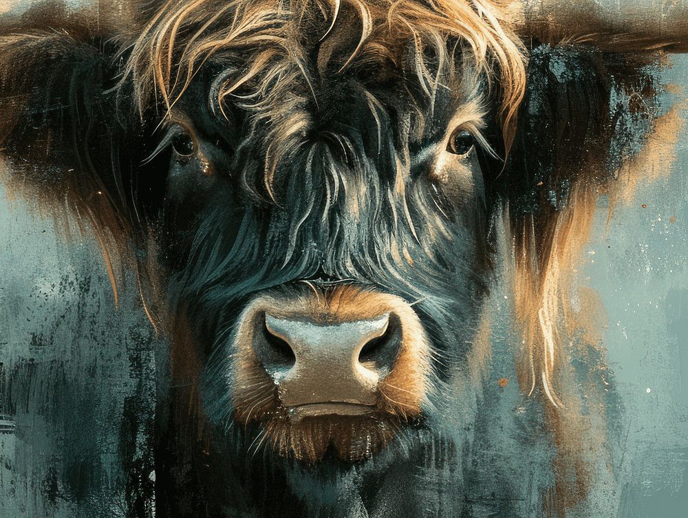 Stoic Gaze" ; montre le portrait impressionnant d'un highlander écossais, enveloppé dans une atmosphère de mystère et de force. L'arrière-plan brumeux et la texture robuste de sa fourrure sont mis en valeur par une palette de couleurs subtiles de tons bleus et gris, soulignant la nature dure et l'intransigeance de l'animal. Cette œuvre d'art capture l'essence de la nature vierge et de l'héritage fier des Highlands écossais, et serait un ajout remarquable à tout espace recherchant une atmosphère rustique mais majestueuse.