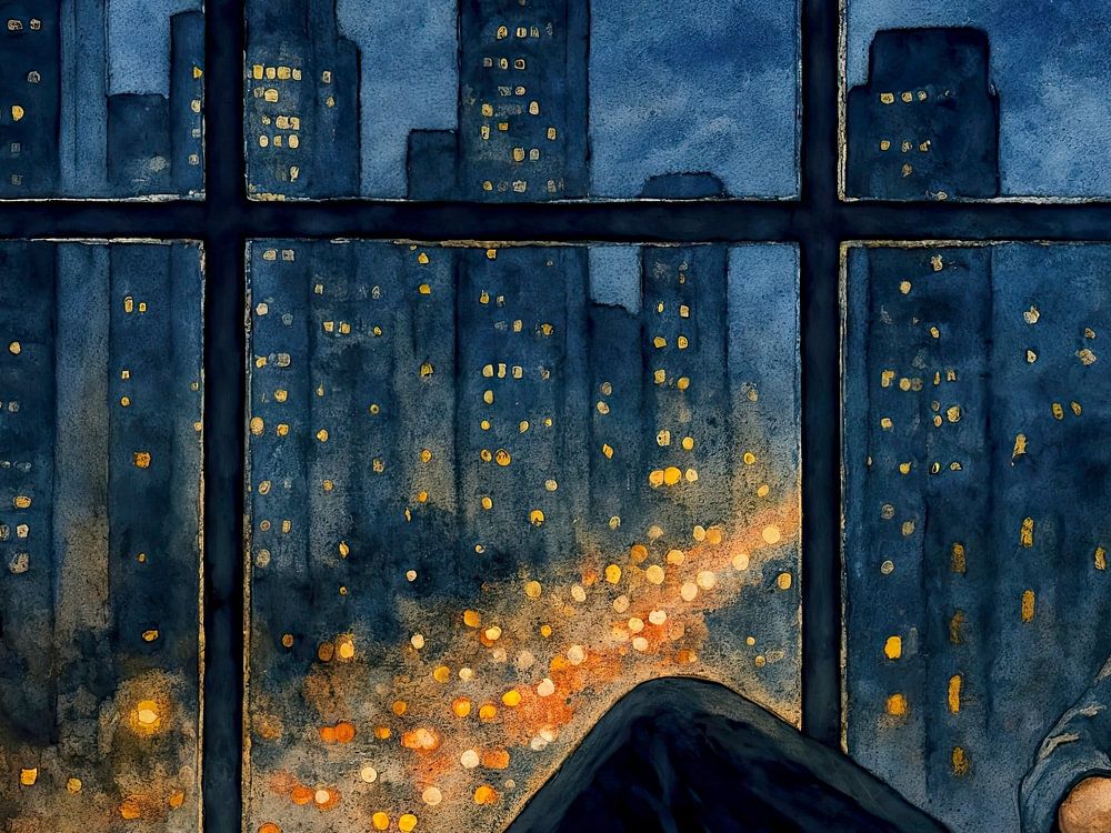 Cette peinture capture un moment intime lors d'une soirée d'hiver. Une femme est assise sur le large rebord de la fenêtre, les jambes levées, le regard fixé sur la ville baignée dans la douce lumière du soir. À côté d'elle se trouve un chat orange qui, comme elle, observe tranquillement la longue série de phares rouges et dorés qui serpentent dans les rues. Les grands immeubles se détachent sombrement sur le ciel bleu nuit, leurs fenêtres éclairées comme de minuscules points chauds.