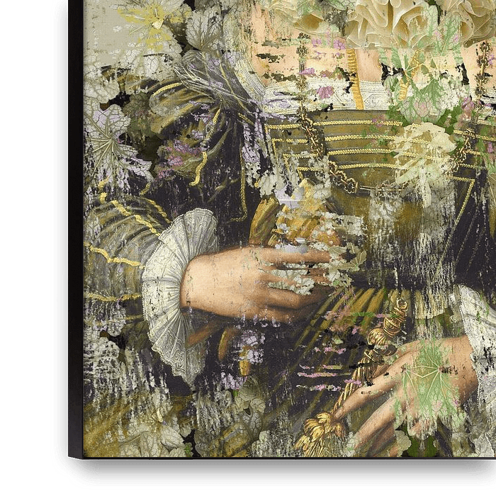 Derrière un rideau de feuilles, une 'dame de la Renaissance&#039 ; avec une touche colorée. Une combinaison abstraite de portraits et de photos d'éléments botaniques.