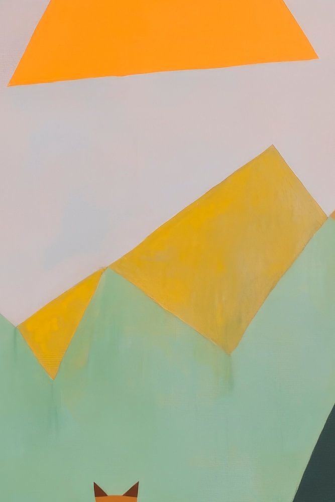 Une palette de couleurs harmonieuse, avec de douces nuances de vert et des accents de jaune chaleureux, donne vie à un paysage de rêve. Le renard espiègle, entouré de montagnes stylisées et d'un grand triangle lumineux, dégage une énergie claire et joyeuse. Cette œuvre d'art convient merveilleusement bien au salon pour y créer une atmosphère accueillante et créative.