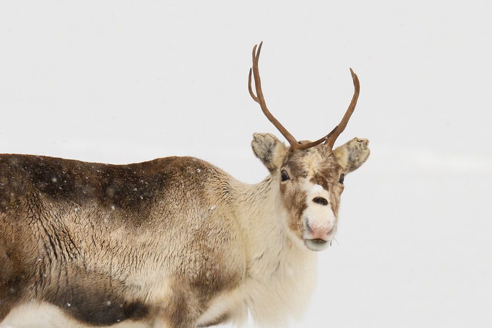 Rennes paissant dans la neige pendant l'hiver dans le nord de la Norvège. Les rennes vivent dans un environnement naturel. L'élevage des rennes est une partie importante de la culture sâme en Scandinavie.