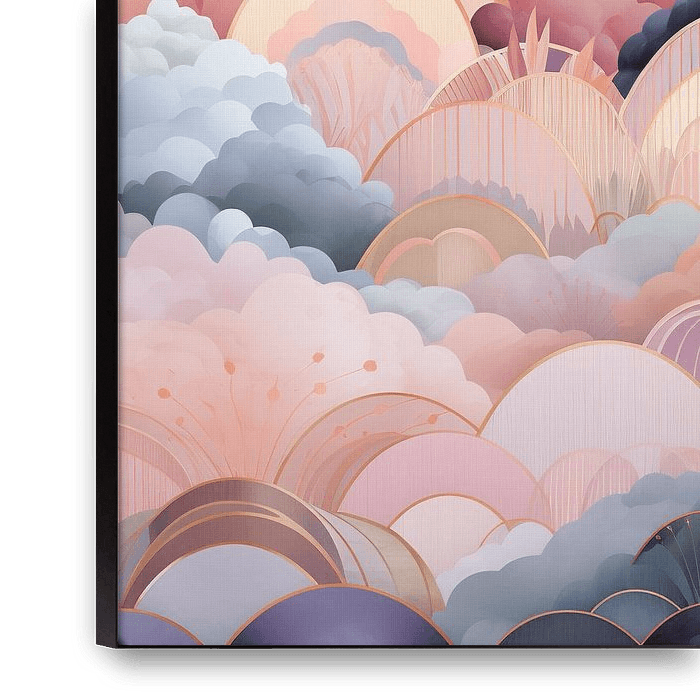 Abstract Calm - Cette œuvre d'art est une image sereine d'arcs et de nuages superposés, élégants et harmonieux, avec une palette de couleurs douces qui passe de Peach Fuzz à un violet profond. Le style graphique et les lignes subtiles enrichissent le sentiment de profondeur et de tranquillité.