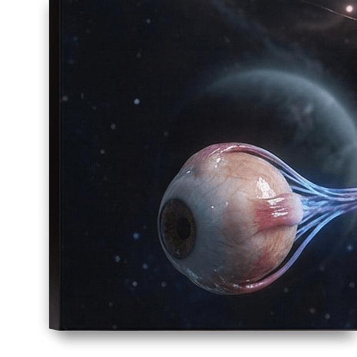 L'échelle est délibérément perturbante. Les yeux deviennent des planètes, les nerfs des canaux d'énergie, et l'espace se transforme en champ de réflexion. L'œuvre suggère que le regard n'est jamais neutre : percevoir, c'est influencer. Celui qui regarde fait partie du système. Cela rend cette image provocante, mais aussi fascinante.