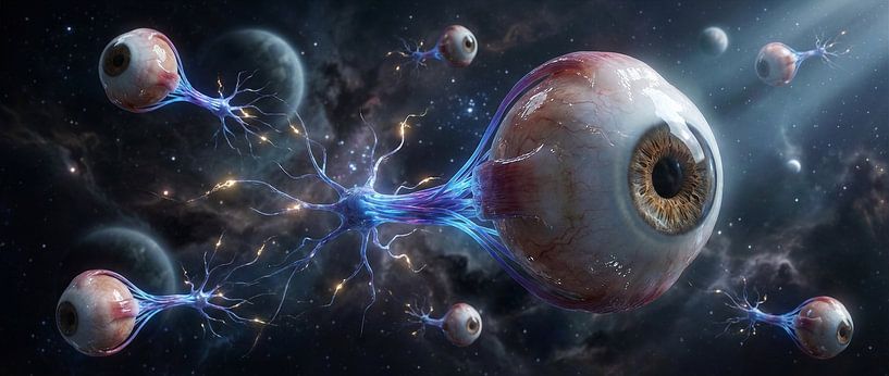 Cette œuvre est inconfortable à juste titre. Des yeux flottants, reliés par des nerfs lumineux, dérivent dans un vide cosmique, comme si la perception elle-même avait développé son propre écosystème. Ici, l'œil n'est pas un récepteur passif, mais un nœud actif. Tout regarde, tout est connecté, et il est impossible d'échapper à ce regard.