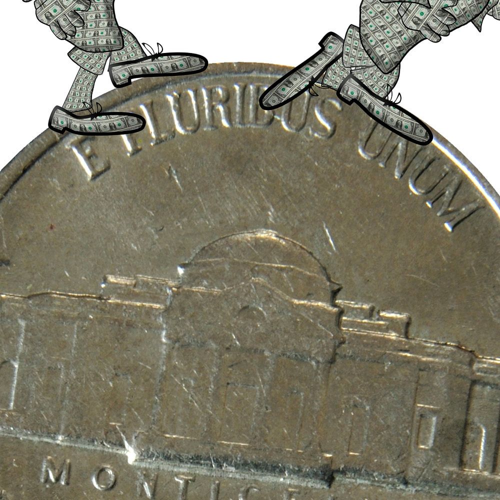 Deux "types" de dollars courant aussi vite que possible sur une pièce américaine de 5 cents. Concept - Les banquiers centraux de la Réserve fédérale maintiennent l'économie américaine en rotation et l'inflation en échec. Concept - Assouplissement quantitatif. Concept - les travailleurs des États-Unis d'Amérique qui travaillent dur pour gagner leur vie. Concept - circulation monétaire M3. Karikatur.Zwei Dollar-"Typen", die so schnell wie möglich auf einer amerikanischen 5c-Nickelmünze laufen. Concept - Les banques centrales de la Réserve fédérale, qui doivent faire reculer l'économie américaine et mettre l'inflation en veilleuse. Principe - Verrouillage quantitatif. Principe - Les travailleurs des États fédérés d'Amérique travaillent dur pour améliorer leur niveau de vie. Konzept - M3 Geldumlauf.