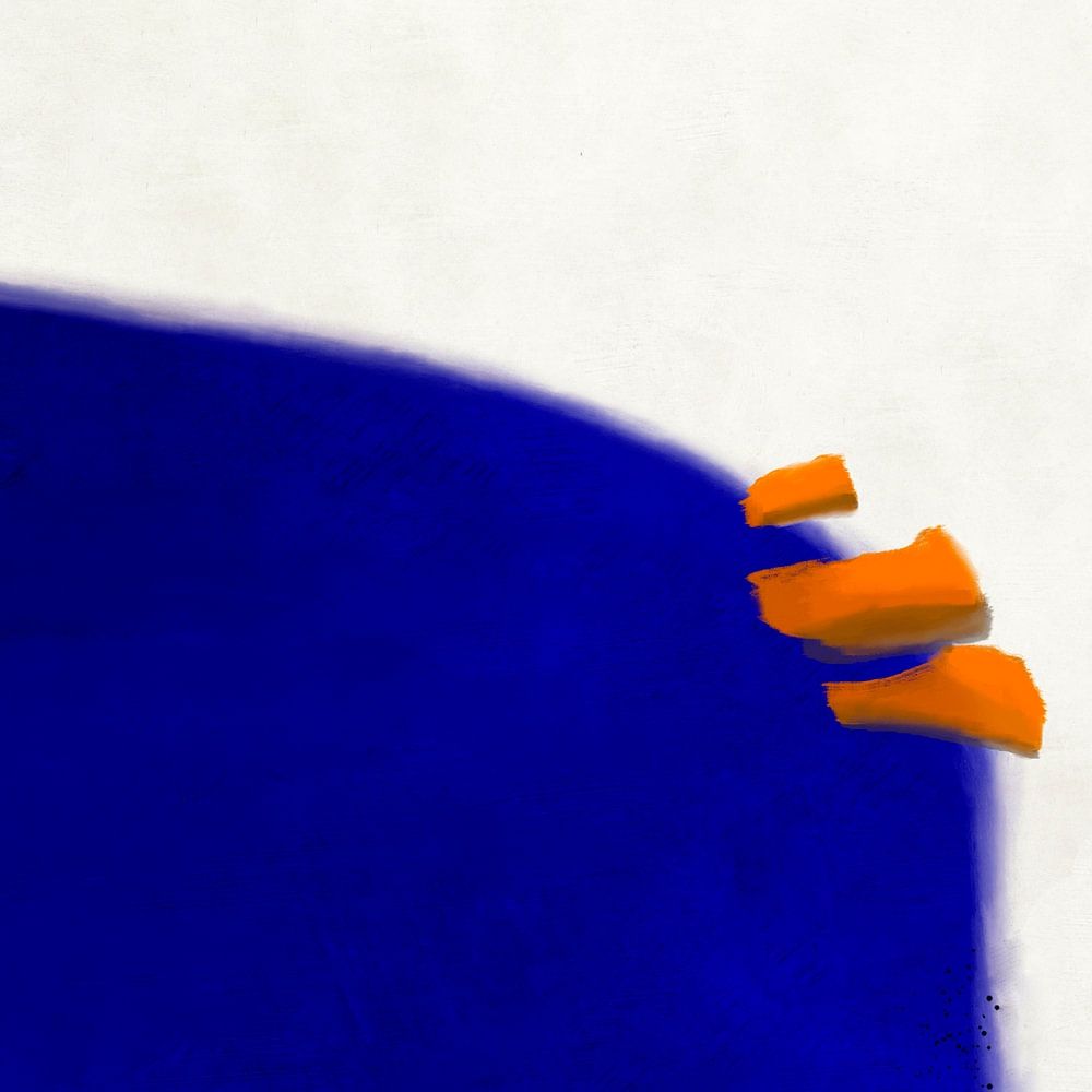 Œuvre d'art moderne abstraite et minimaliste d'un bleu éclatant, contrasté par quelques touches de couleur orange.