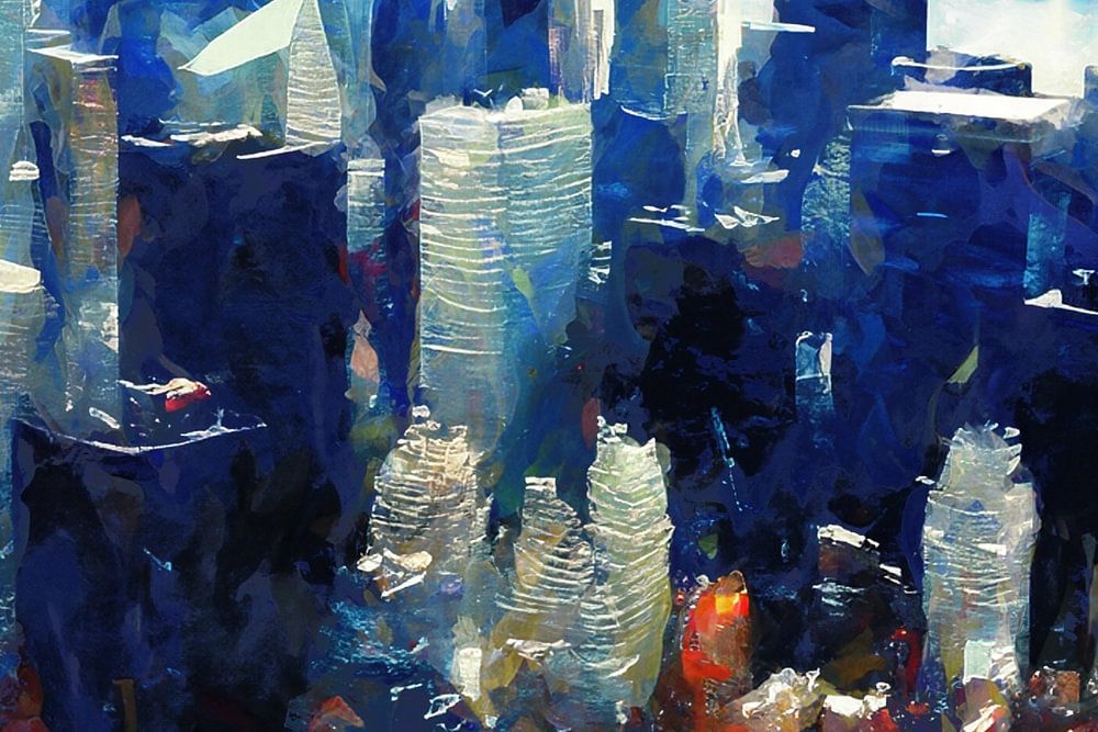 Au cœur de ce chef-d'œuvre se trouve la ligne d'horizon emblématique de Manhattan, transformée en une représentation abstraite et artistique. Chaque ligne, chaque plan et chaque ombre semble danser dans l'image, donnant à la ville une nouvelle dimension. Cette splendeur urbaine est non seulement capturée mais aussi interprétée d'une manière qui stimule l'imagination.