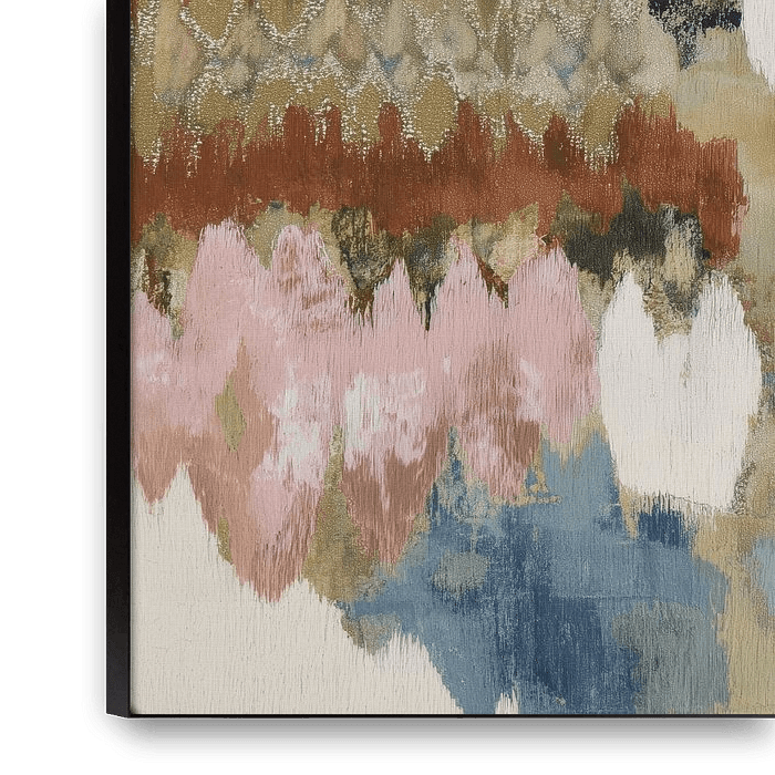 Composition abstraite organique avec des motifs en zigzag fluides dans des tons terreux discrets. Les coups de pinceau superposés dans les tons olive, rose, bleu marine et crème créent de la profondeur et du mouvement, avec une qualité inspirée des textiles bohèmes.