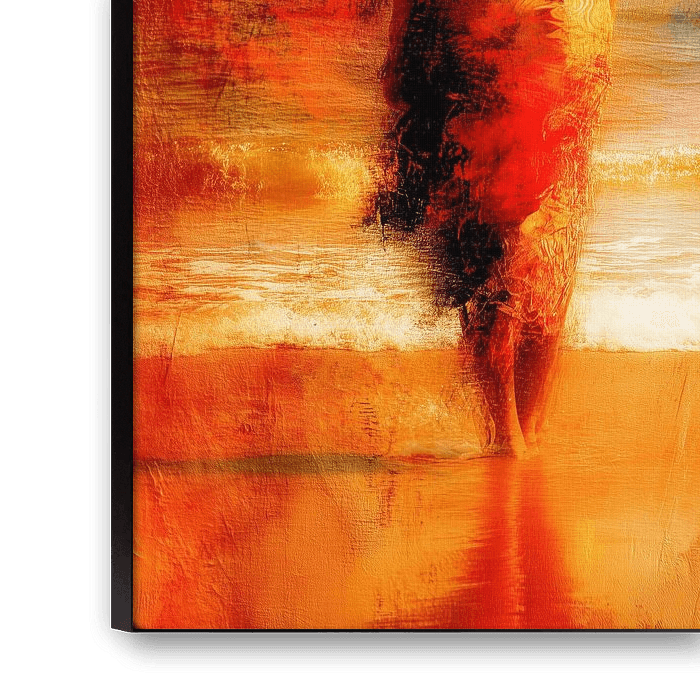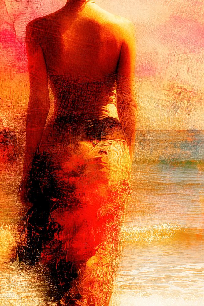 Une femme aux cheveux d'un rouge éclatant regarde une plage ondulée, avec un ciel qui ressemble à une explosion de couleurs flamboyantes. Une scène onirique, presque surréaliste.