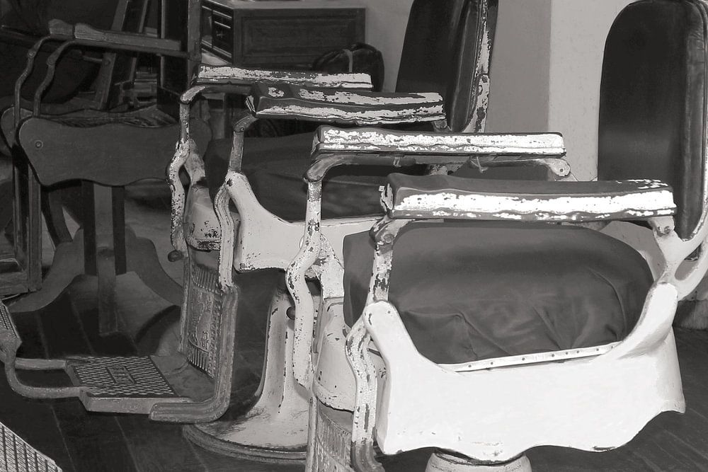 Intérieur d'un salon de coiffure rétro (barbershop) avec des fauteuils de coiffeur en fer à l'ancienne dans l'ancienne ville de Wuzhen (Chine). Les clients attendent le barbier / barber / barber pour faire retoucher leur coupe de cheveux / coiffure. Nostalgie, démodé, antique, chaises brocantes. Style de vie vintage. Photographie de voyage.