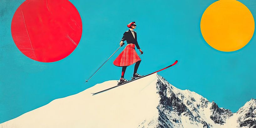 Cette œuvre d'art représente une femme rétro à skis sur une crête montagneuse, placée entre deux formes circulaires dans les airs. La femme est représentée de profil et forme un lien entre l'homme, la montagne et le ciel. La composition s'articule autour de la position et des proportions. La disposition des cercles crée un jeu entre la gauche et la droite, entre le début et la fin. Cette œuvre donne envie d'être accrochée au mur, car elle combine calme et tension en une seule image. Elle laisse place à la réflexion sans donner d'explications. Elle peut servir de point focal dans une pièce, mais aussi de toile de fond pour les moments quotidiens. Elle invite à regarder, à faire une pause et à regarder à nouveau, sans que l'image ne soit figée dans une seule signification. La palette de couleurs se compose de bleu, rouge, jaune, blanc, noir et couleur chair. Ces couleurs sont utilisées dans des zones qui se touchent sans se mélanger. La montagne forme une base, le ciel un champ ouvert et les cercles apportent une direction.