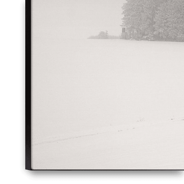 Paysage enneigé avec des champs, recouverts d'une couverture de neige et d'une forêt. La photographie est réalisée en noir et blanc et dans un ton chaud minimaliste.